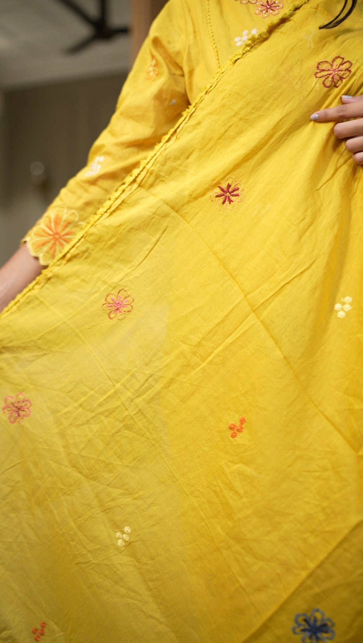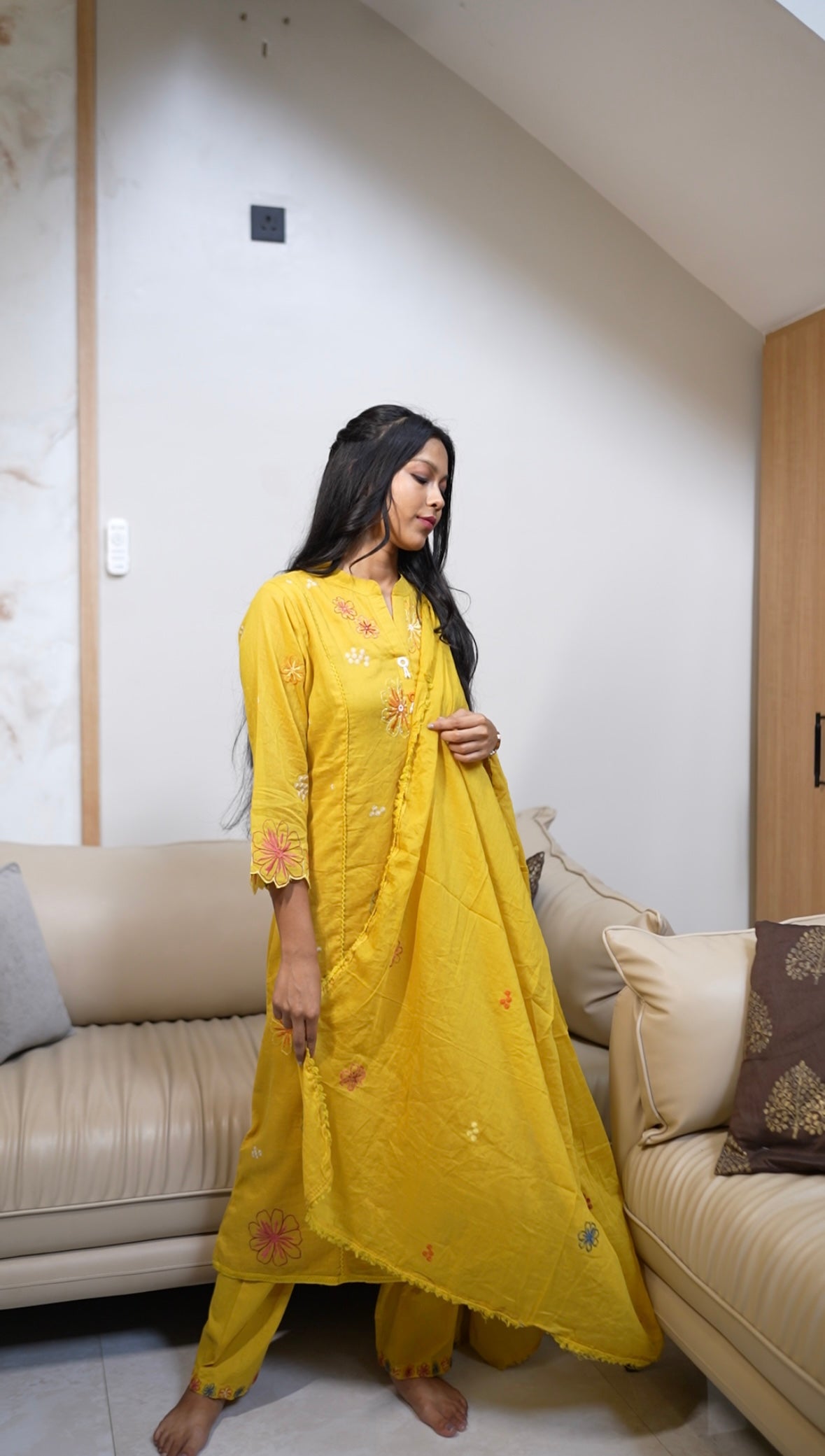This cotton suit in a vibrant yellow shade features a delicate floral pattern, combining comfort with elegance. Its breathable fabric ensures all-day wearability, while the bright color adds a fresh, cheerful touch to your wardrobe. Ideal for both casual and semi-formal occasions, this suit offers a perfect blend of style and practicality.